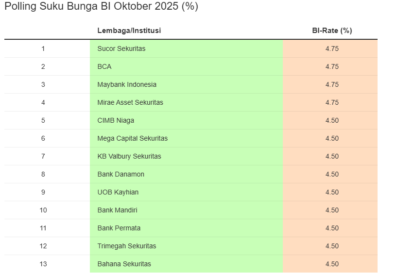 Beberapa lembaga/institusi pun memperkirakan BI akan menurunkan suku bunga ke level 4,50%. Salah satunya adalah KB Valbury Sekuritas yang memperkirakan BI akan kembali memangkas suku bunga acuan sebesar 25 basis poin (bps) ke level 4,50%.