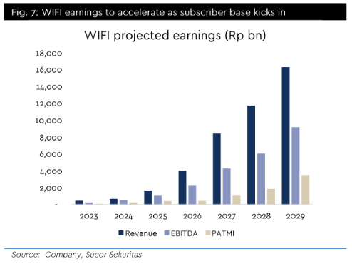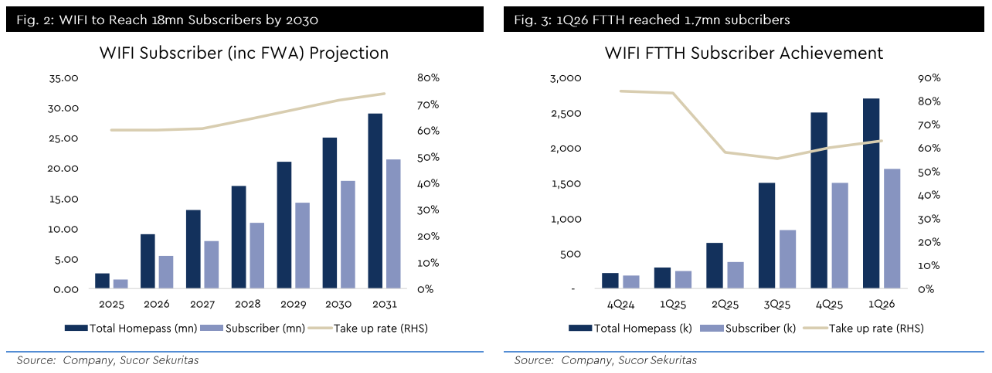 On the FWA front, which is WIFI's big bet, our analyst notes encouraging traction. As of 16 March, 208,000 FWA subscribers were on-board from 236 active BTS sites at an implied take-up rate of 88%. With around 600 BTS already on-air, potential subscribers could reach 530,000. Management guides 3.2 million FWA and 2.3 million FTTH subscribers by end-FY26. To fund this, WIFI reallocated Rp5.9 trillion from its rights issue proceeds to PT Jaringan Infra Andalan (JIA), covering CPE, RAN, and spectrum fees, with total FWA capex expected at approximately Rp6.4 trillion. Rollout acceleration is expected to become more visible in 2H26, given equipment lead times of 2 to 4 months.