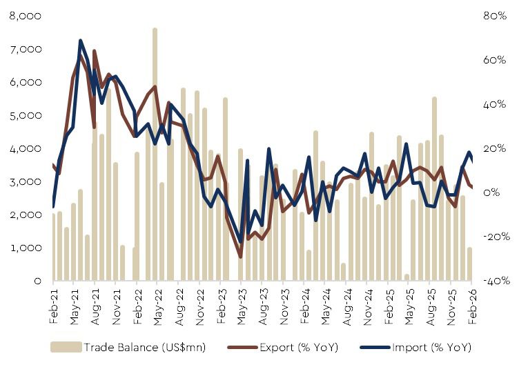 Indonesia just recorded its 69th consecutive month of trade surplus in February. While the US$1.28 billion figure came in slightly below market expectations, there is a compelling detail beneath the surface: capital goods imports saw double-digit growth. This is a clear signal that investment activity on the ground is gaining serious traction. Rather than viewing this as a sign of weakness, our economist sees it as a transition phase before we enter a significantly stronger quarter.