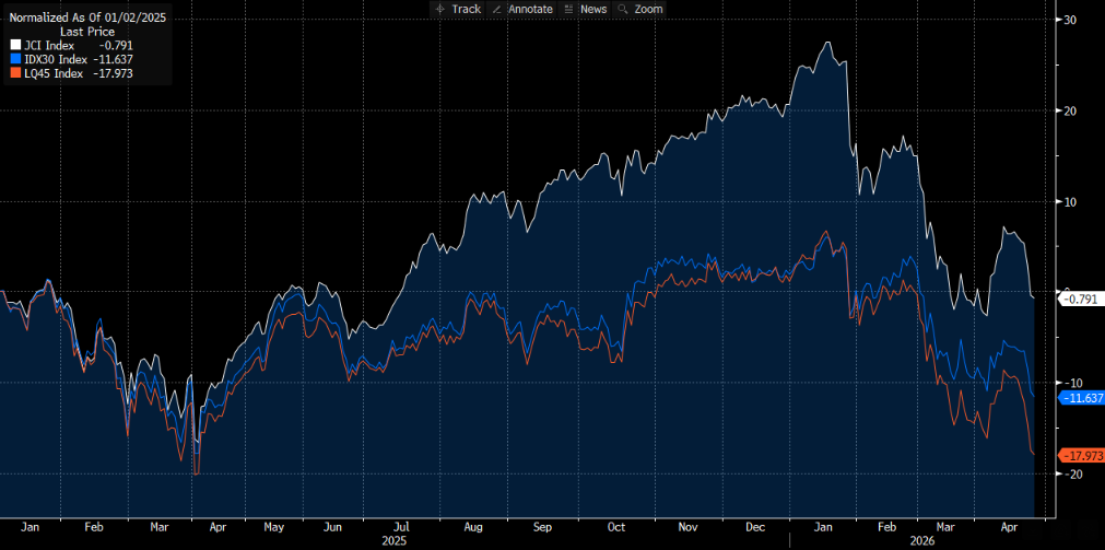 The outperformance is largely attributable to sustained retail participation in second- and third-tier stocks, while foreign investors have continued to reduce exposure, particularly in large-cap names. As a result, indices with higher blue-chip concentration, such as LQ45 and IDX30, have come under greater pressure, highlighting the current split between domestically driven flows and weaker offshore sentiment.