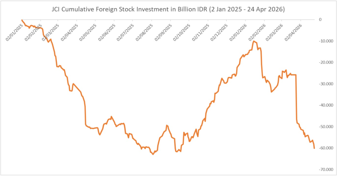 From 2 January 2025 through 24 April 2026, foreign investors have recorded cumulative net capital outflows of more than IDR 60tn from the Indonesian equity market, reflecting a notable deterioration in external sentiment toward domestic assets. The sustained selling suggests that international investors have become increasingly cautious on Indonesia relative to regional peers.