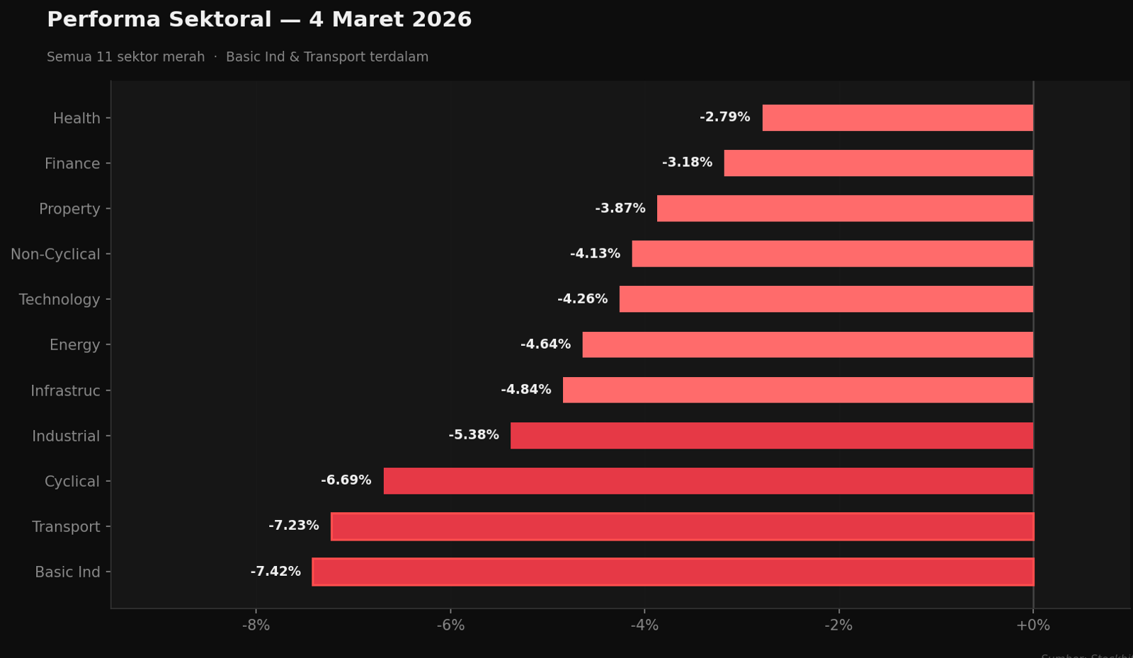 The capital market often tolerates a single piece of bad news, but today reached a saturation point where multiple negative sentiments conspired to test the very limits of investor resilience. At the close of March 4, 2026, the JCI plummeted to 7,577, a drastic 4.57% drop in a single session fueled by panic. This was no ordinary technical correction; it was a massive, organized sell-off that left the LQ45 index helpless, sliding 4.11%. Every single sector landed in the red, reflecting an instant evaporation of market confidence as global geopolitical escalations and domestic fiscal credibility shocks hit simultaneously.
