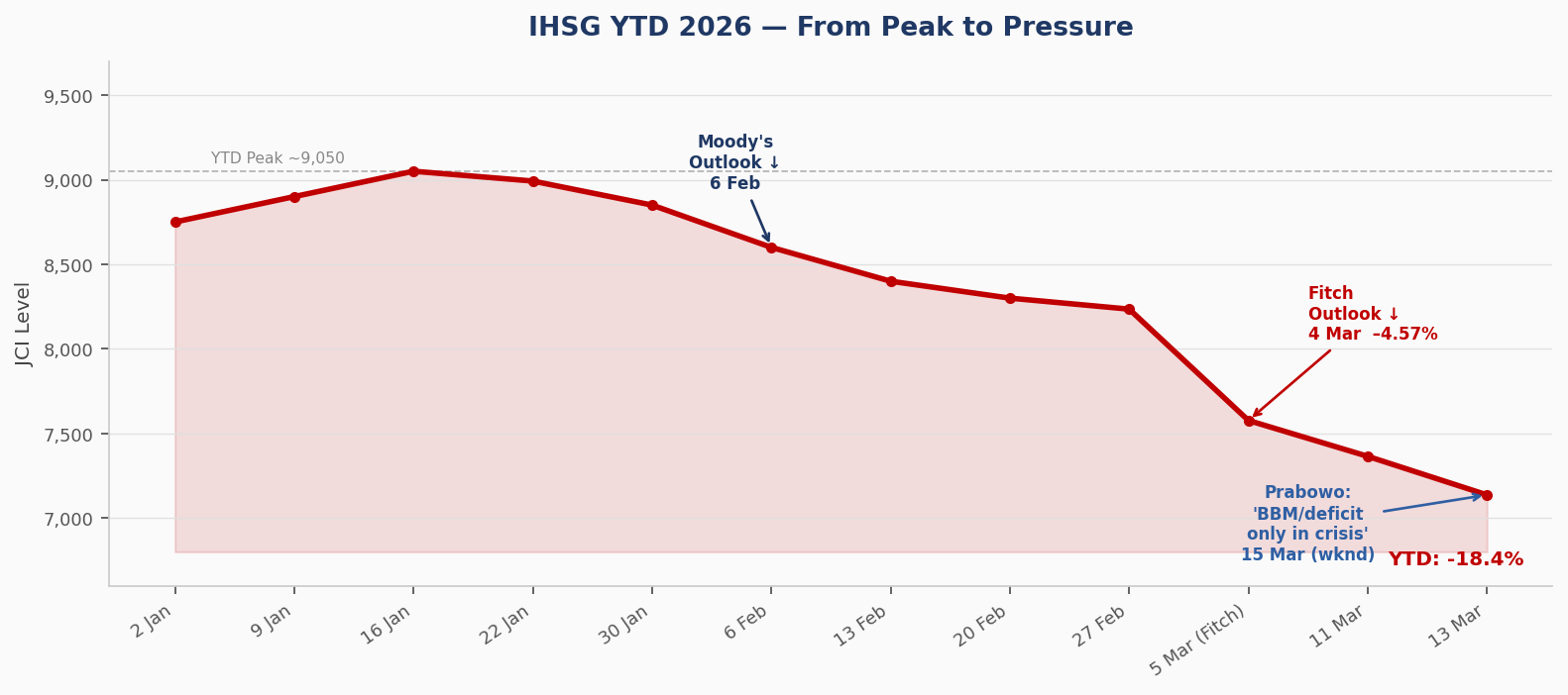 IHSG YTD 2026 — down ~18.7% from the January peak of ~9,050 to 7,137 as of 13 March. Key macro events annotated. Sources: Bloomberg, Investing.com.