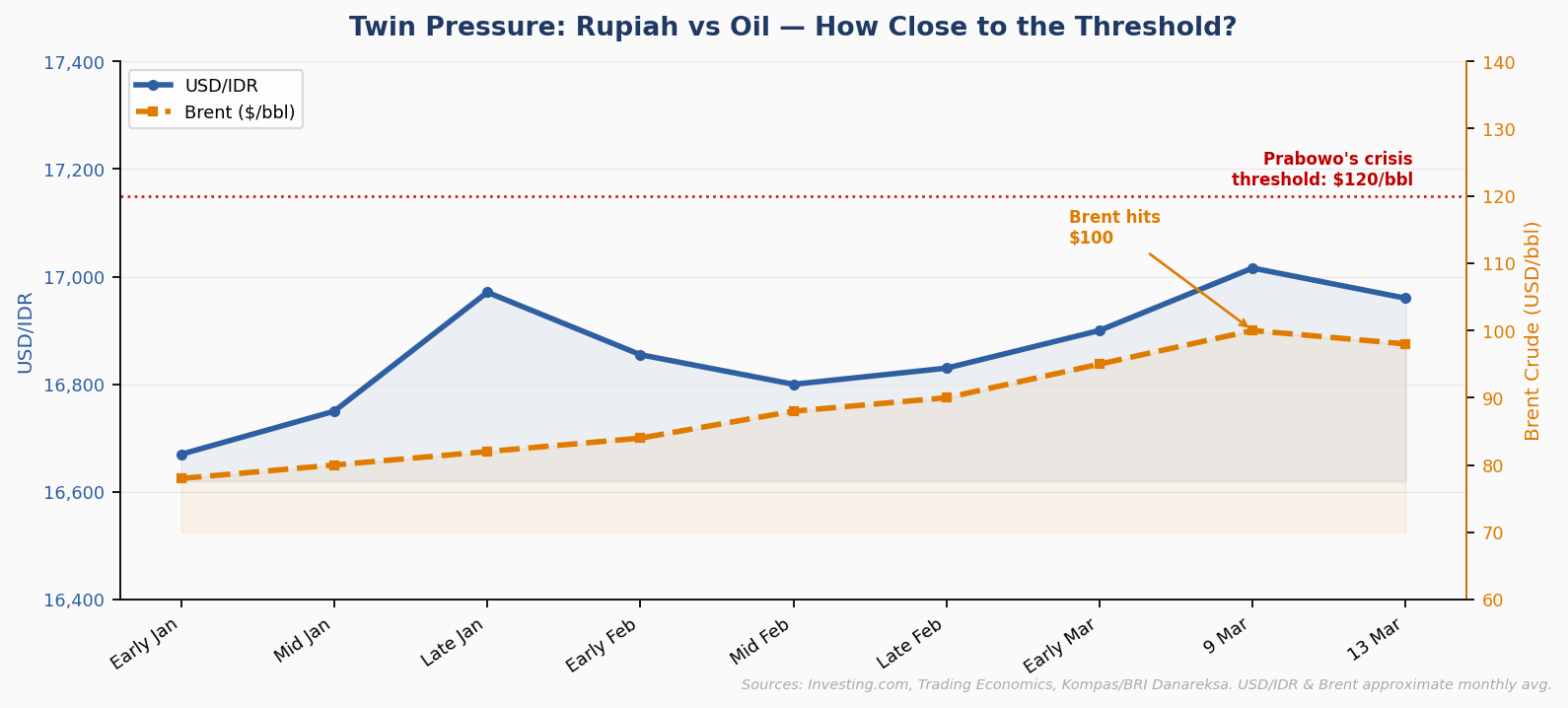 Twin pressure: USD/IDR near 16,960 vs Brent at ~$98/bbl. Dotted line marks Prabowo's stated crisis threshold at $120. Sources: Trading Economics, Bloomberg.
