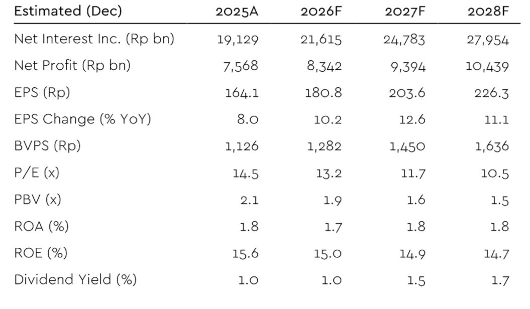 Within the banking space, BRIS stands out with a differentiated growth narrative. FY25 earnings reached Rp7.6tn (+8% YoY), supported by robust loan growth, sharply lower funding costs, and strong fee income momentum. Beyond core banking, the gold segment continues to scale as a structural growth pillar, contributing 9.4% of revenue and 7.2% of loans, with management targeting up to 1.5mn new gold customers in 2026. This adds a unique cross-selling and ecosystem-driven growth lever that is less correlated with traditional credit cycles. Asset quality saw temporary pressure from Aceh–Sumatra flooding, with LAR rising to 9.2%, but management continues to guide credit costs below 1%, suggesting risks remain manageable and largely event-driven rather than structural. Looking ahead, earnings growth is expected to remain in double digits through 2026–27, supported by balance sheet expansion and improving operating leverage.