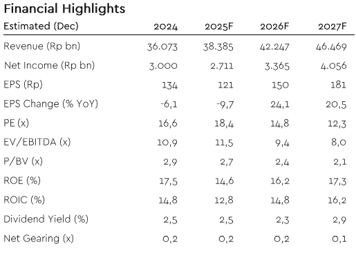On the balance sheet side, disciplined capex of around Rp1.0 trillion in FY25–26F should sustain solid free cash flow generation ahead of the planned capacity expansion in 2029F. This measured capital cycle enhances financial flexibility and supports a gradual increase in the dividend payout ratio toward 45%, implying potential dividend yield approaching 5% over the medium term.