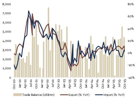USD2.40 bn surplus in October, easing from September’s US$4.34bn and undershooting expectations. This marked the 66th straight month of surplus, but momentum softened as both exports and imports lost strength.