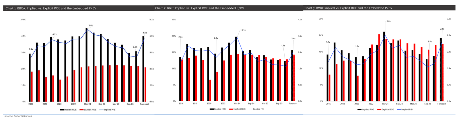 Indonesia’s three largest banks are expected to be among the key beneficiaries of stronger government fiscal spending, with GDP growth projected to exceed 6% this year. Despite the supportive macro outlook, share prices of these banks have declined significantly, falling approximately 30%–40% from their peak levels, which has also compressed implied P/B valuations by around 35%–45%. The magnitude of this correction appears disproportionate to the underlying fundamentals, as core operating performance remains relatively solid. Should market sentiment improve, BBCA, BBRI, and BMRI could potentially deliver total returns of around 35%–45% over the next sixteen months.