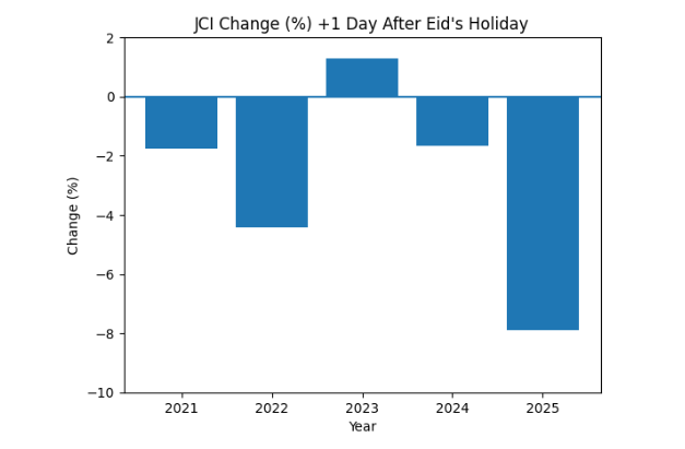 Given the current environment, a relatively prudent strategy for investors is to raise cash ahead of the Eid holiday period. Historically, over the past five years, the JCI has recorded four declines on the first trading day after the Eid holiday, with the largest drops occurring in 2022 (-4.4%) and 2025 (-7.8%). These declines were largely driven by external factors, including the Fed’s 50 bps rate hike in 2022 and Trump’s global tariff policy in 2025. The current environment shares similarities with those periods, which has contributed to a more risk-off stance among investors.