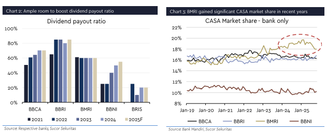Leading the pack, BBRI stands out as a defensive pick with an attractive 8-9% dividend yield and a clear earnings recovery cycle starting in 2026F as MSME credit costs normalize. Meanwhile, BMRI offers a deep value proposition, supported by a superior 80% CASA ratio resulting from a digital transformation that has structurally strengthened its funding franchise.