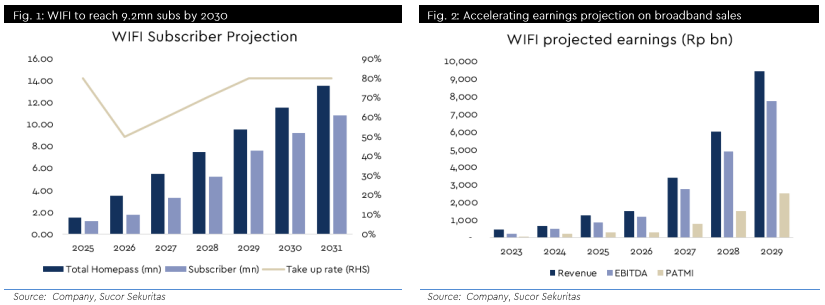 The numbers also speak for themselves. In 1H25, WIFI booked EBIT and EBITDA margins of 60% and 75%, with earnings projected to grow at a 61% CAGR over the next five years. Our analyst sets a DCF-based target price of Rp7,800, which remains conservative. If current valuation multiples hold, the theoretical price could reach Rp34,400 by 2030, translating into a 65% CAGR.