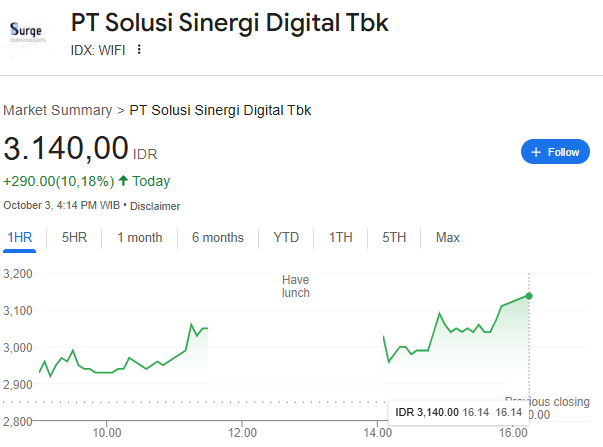 Sometimes the market gives you a clue before the story goes mainstream. On October 3, shares of WIFI (PT Solusi Sinergi Digital) jumped +10.18% to Rp3,140, just hours after the company unveiled Indonesia’s first Wi-Fi 7 network in Bali.